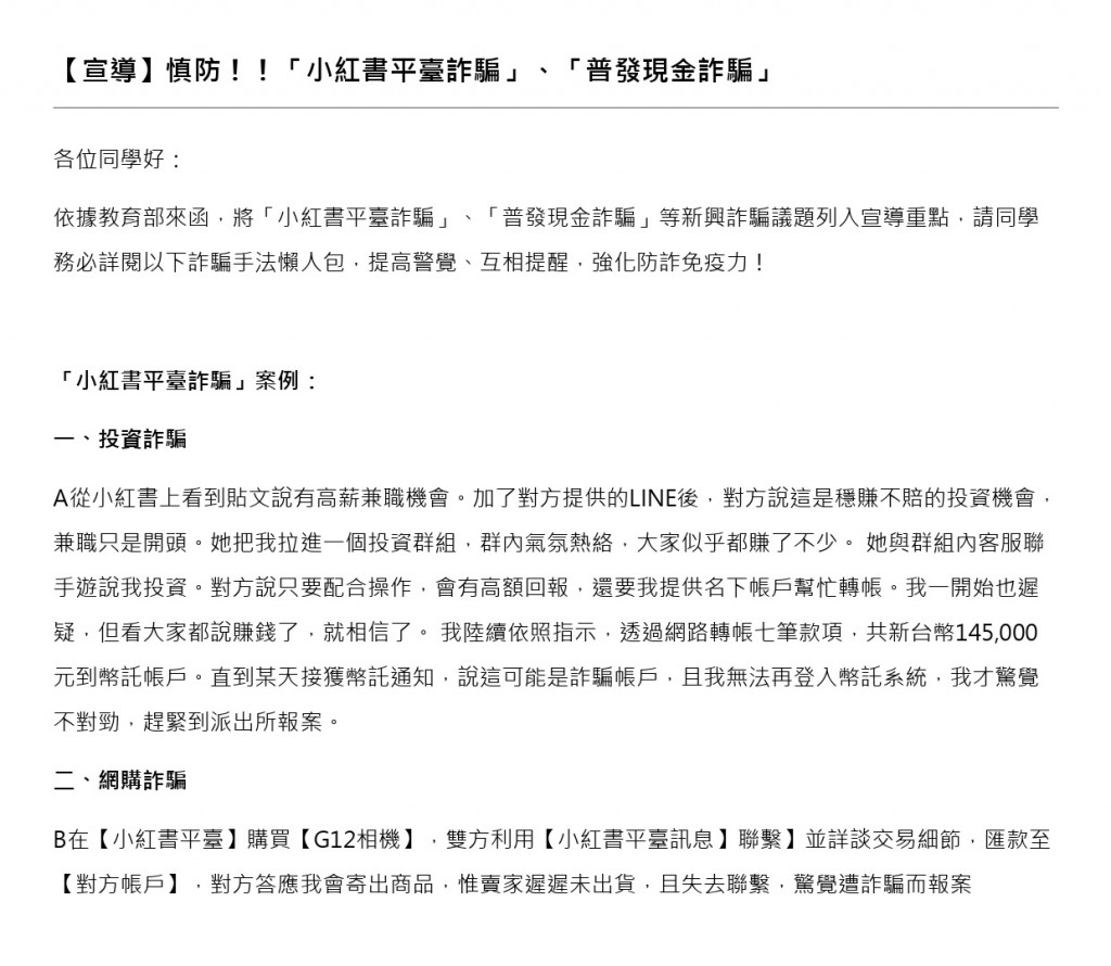 轉知:教育部國教署防制校園詐騙「小紅書風險議題」重點宣導,敬請民眾參閱及多加留意。