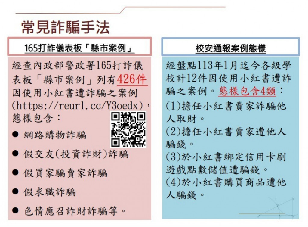 二、近年「境外APP小紅書」為國人下載使用,產生資訊安全疑慮、詐騙或其他校園安全事件,經查內政部警政署165打詐儀表板「縣市案例」列有423件因使用小紅書遭詐騙之案例,態樣包含:網路購物詐騙、假交友(投資詐財)詐騙、假買家騙賣家詐騙、假求職詐騙、色情應召詐財詐騙等。